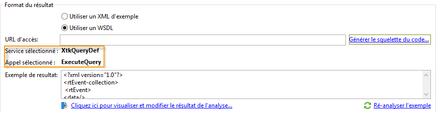 Dans le cas d'une WSDL, entrez l'URL d'accès correspondante puis générez le squelette du code. Le service et l'appel sélectionnés sont automatiquement mis à jour et s'affichent.