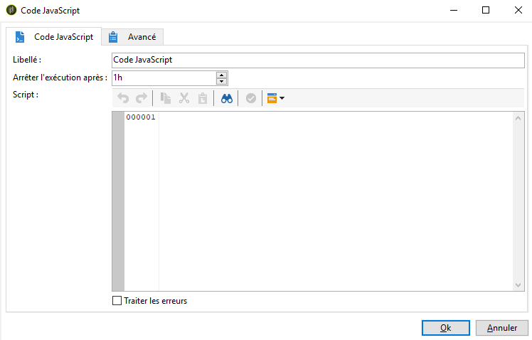 À compter de la version 20.2, un délai d‘exécution a été ajouté aux activités code JavaScript et code JavaScript avancé. Par défaut, la phase d’exécution ne peut pas dépasser 1 heure. Après ce délai, le processus est abandonné avec un message d‘erreur et l‘échec de l’exécution.