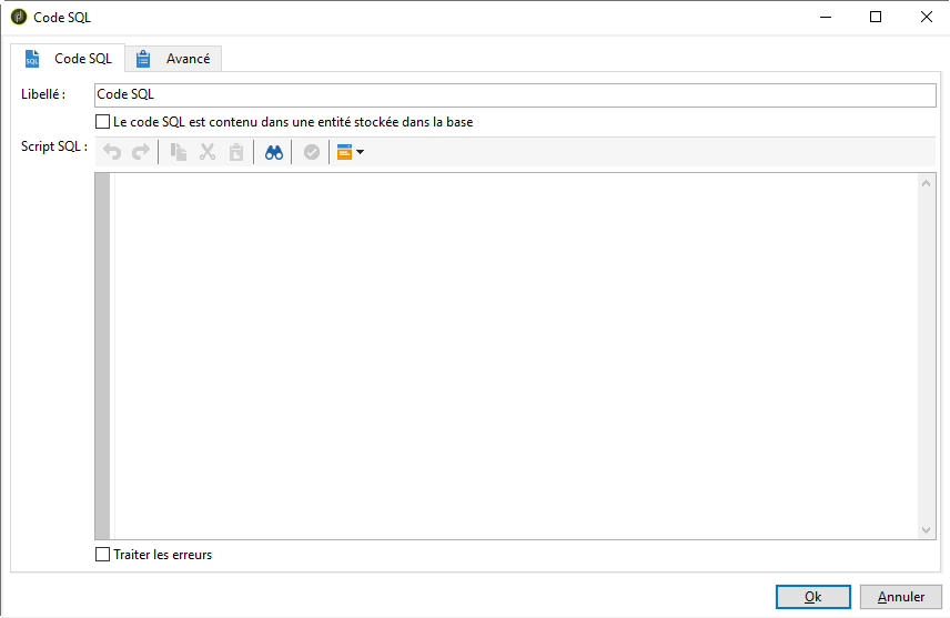Une activité de type Code SQL exécute un script SQL. Le script est un template JST.
