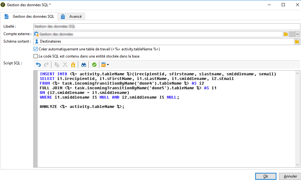 Il incombe à la personne chargée de l'écriture du script SQL de s'assurer que celui-ci est fonctionnel et que ses références (noms de champs, etc.) sont conformes au schéma sortant.