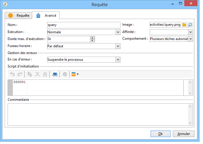 L'écran des propriétés d'une activité comporte un onglet Avancé vous permettant notamment de définir le comportement en cas d'erreur, la durée d'exécution de l'activité ou encore et de saisir un script d'initialisation. Cet onglet se présente sous deux formes :