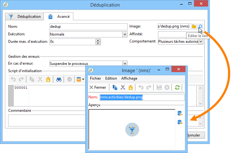 Pour changer l'image associée à une activité, double-cliquez sur l'objet et cliquez sur l'onglet Avancé.