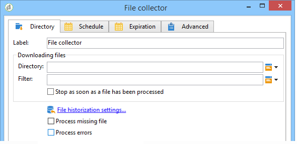 의 첫 번째 탭 File collector 활동을 통해 소스 디렉토리를 선택하고 필요한 경우 수집된 파일을 필터링할 수 있습니다. 다른 탭은 인바운드 전자 메일 (Schedule 및 Expiry 탭).