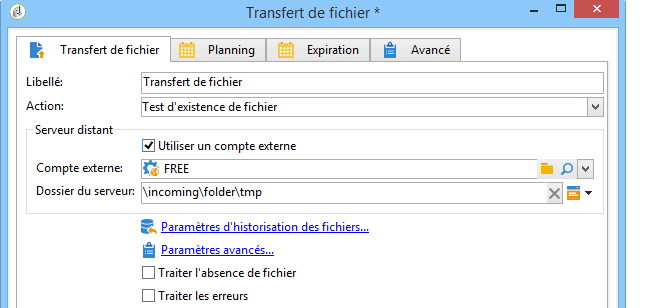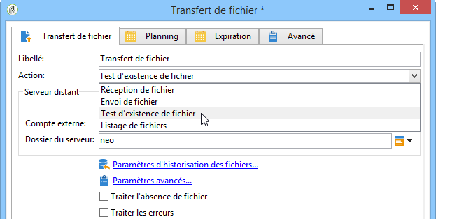 Pour tester l'existence d'un fichier, sélectionnez l'option Test d'existence de fichier dans le champ Action. Le paramétrage du serveur distant est le même que pour la réception de fichiers. Pour plus d'informations, reportez-vous à cette section.