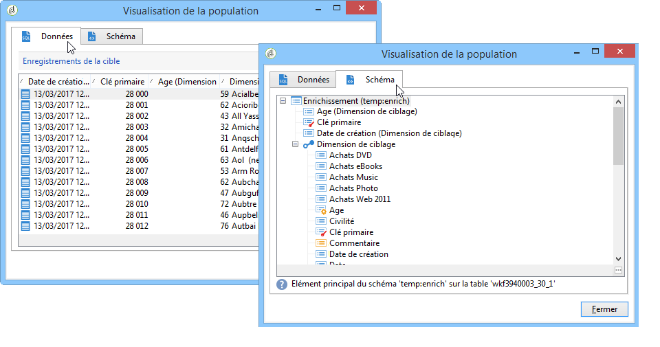 Ce menu affiche les données relatives à la population de la cible ainsi que la structure de la table de travail (onglet Schéma).