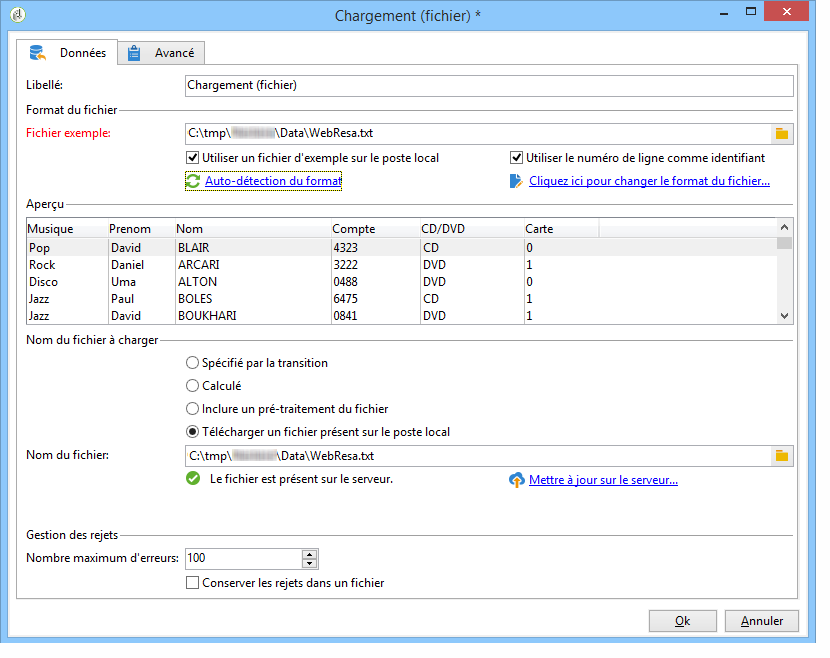 L'activité de chargement de fichier est paramétrée comme suit :