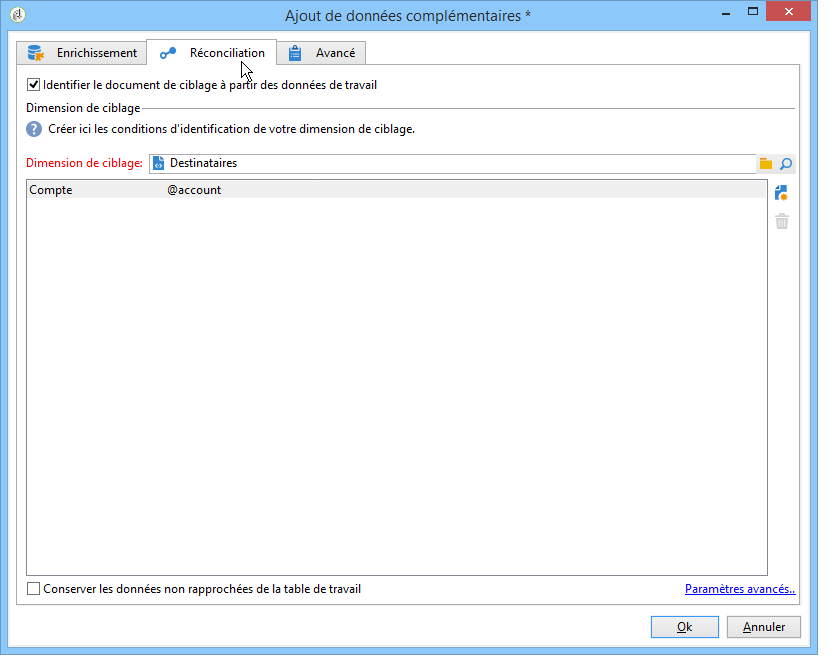Paramétrez l'activité de type Enrichissement afin de réconcilier les données collectées avec celles de la base Adobe Campaign.