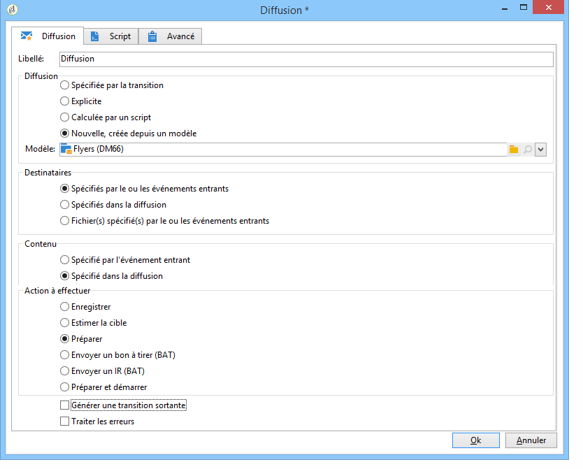 Configurez ensuite la Diffusion : elle est créée depuis un modèle et les destinataires sont ceux spécifiés par la transition entrante.