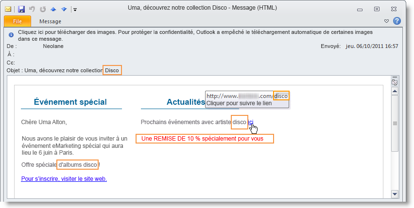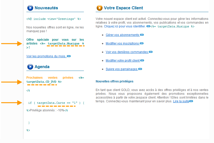 Les données de type Extension de la cible (targetData) sont insérées dans les diffusions selon les mêmes caractéristiques que tous les champs de personnalisation. Elles peuvent ainsi par exemple être utilisées dans l'objet du message, les libellés des liens ou les liens eux-mêmes, etc.