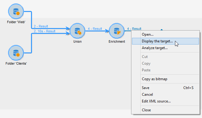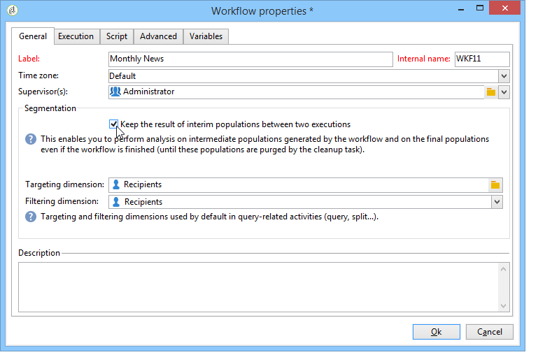 워크플로우가 실행되면 타겟 데이터가 삭제됩니다. 마지막 작업 테이블만 액세스할 수 있습니다. 모든 작업 테이블에 액세스할 수 있도록 워크플로우를 구성할 수 있습니다. 확인 Keep the result of interim populations between two executions 옵션을 클릭합니다.