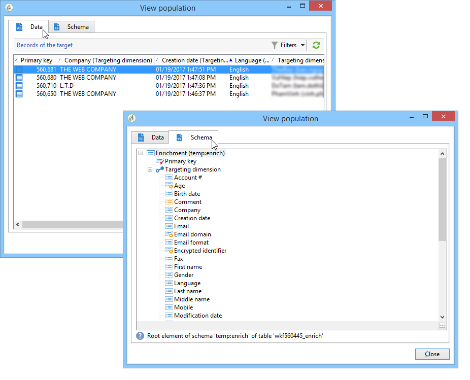 이 메뉴에는 작업 테이블의 구조와 대상 모집단에서 사용할 수 있는 데이터가 표시됩니다(Schema 탭).