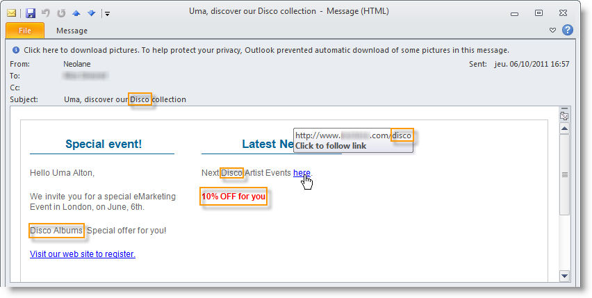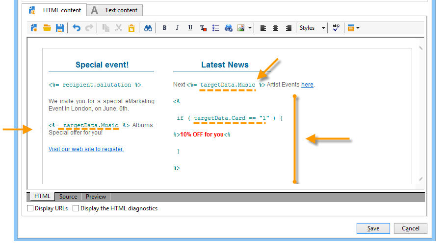 Target extension (targetData) 유형 데이터는 모든 개인화 필드와 동일한 특성을 사용하여 게재에 삽입됩니다. 제목, 링크 레이블 또는 링크 자체에서도 사용할 수 있습니다.