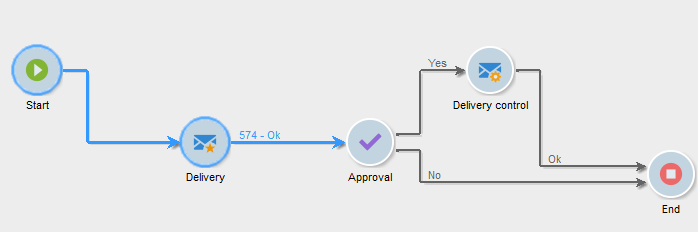예: 시작 및 배달 활동은 승인 활동은 아래 워크플로우에서 깜박입니다.