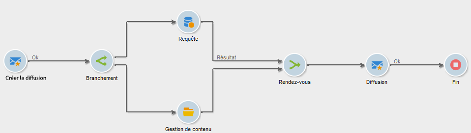Par exemple, vous pouvez utiliser une activité Rendez-vous dans le cadre de la création de contenu et de l’automatisation de l’envoi de diffusions, afin de vous assurer qu’une diffusion n’est lancée qu’une fois les étapes d’interrogation de cible et de mise à jour du contenu terminées. Un cas pratique dédié est disponible dans cette section