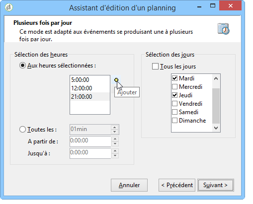 Indiquez les heures et jours d'activation. Les paramètres de cette étape dépendent de la périodicité sélectionnée à l'étape précédente. Si vous choisissez de lancer l'activité plusieurs fois par jour, les options de paramétrage seront les suivantes :