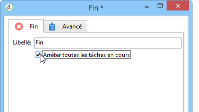 Vous pouvez paramétrer l'activité Fin pour qu'elle interrompe toutes les tâches en cours. Pour cela, double-cliquez sur l'activité pour afficher ses propriétés et cochez l'option correspondante.