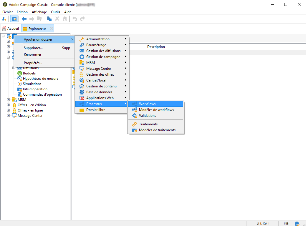A partir de l'Explorateur, accédez à un dossier de workflow. Par défaut, vous pouvez utiliser Profils et cibles > Traitements > Workflows de ciblage.