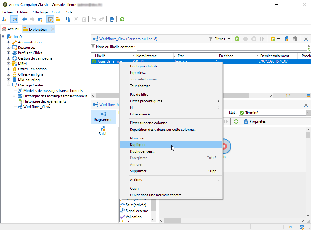 Vous pouvez toutefois créer une vue pour afficher tous les workflows de votre instance. Dans cette vue, vous pouvez dupliquer des workflows à l'aide de la fonction Dupliquer vers.