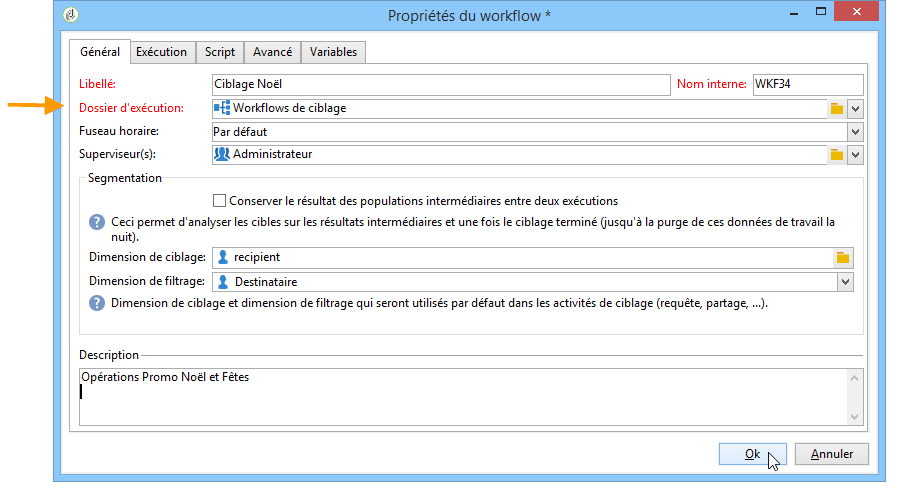 En plus des propriétés habituelles des workflows, les propriétés du modèle permettent d'indiquer le dossier d'exécution des workflows créés à partir de ce modèle.