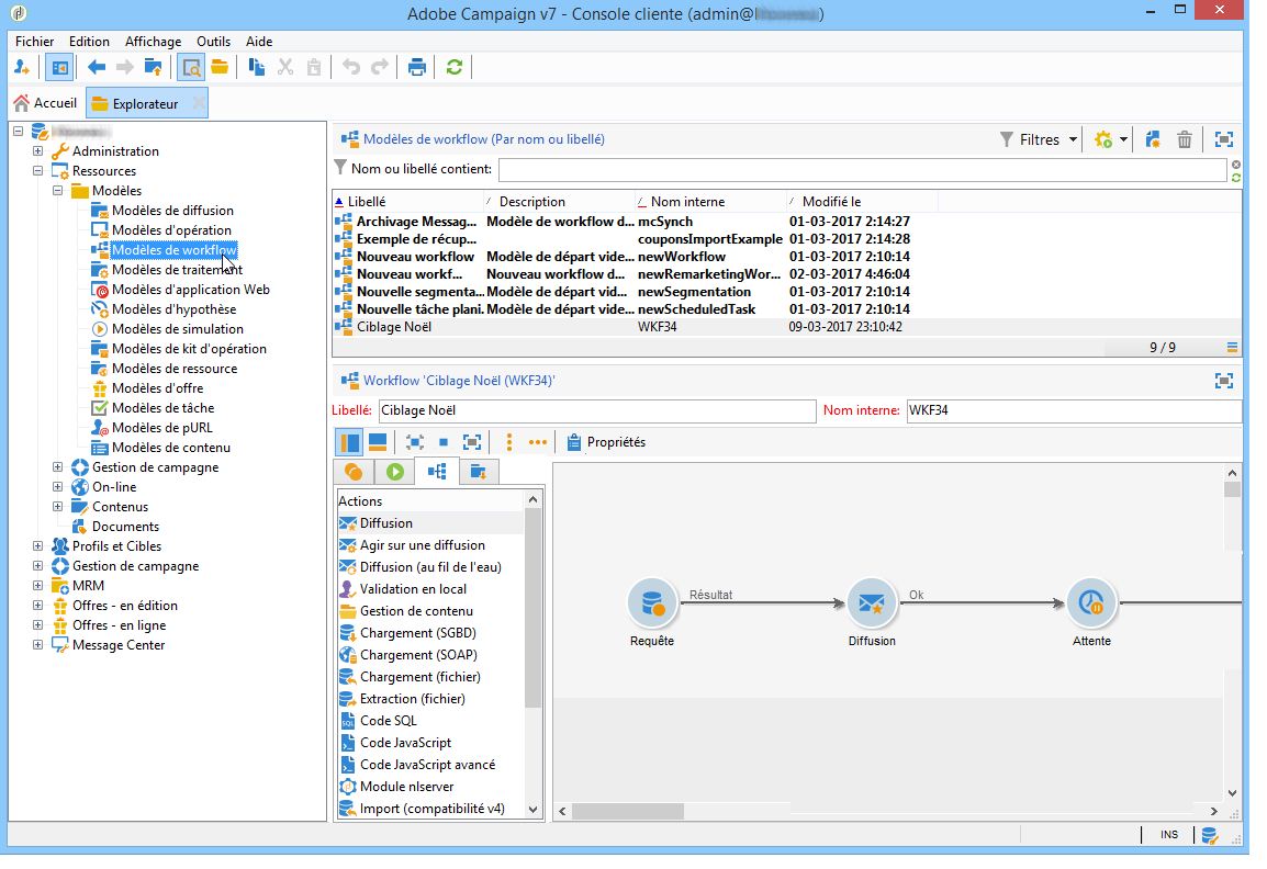 Les modèles de workflows sont stockés dans le noeud Ressources > Modèles > Modèles de workflow de l'arborescence Adobe Campaign.