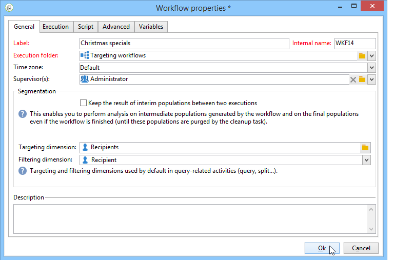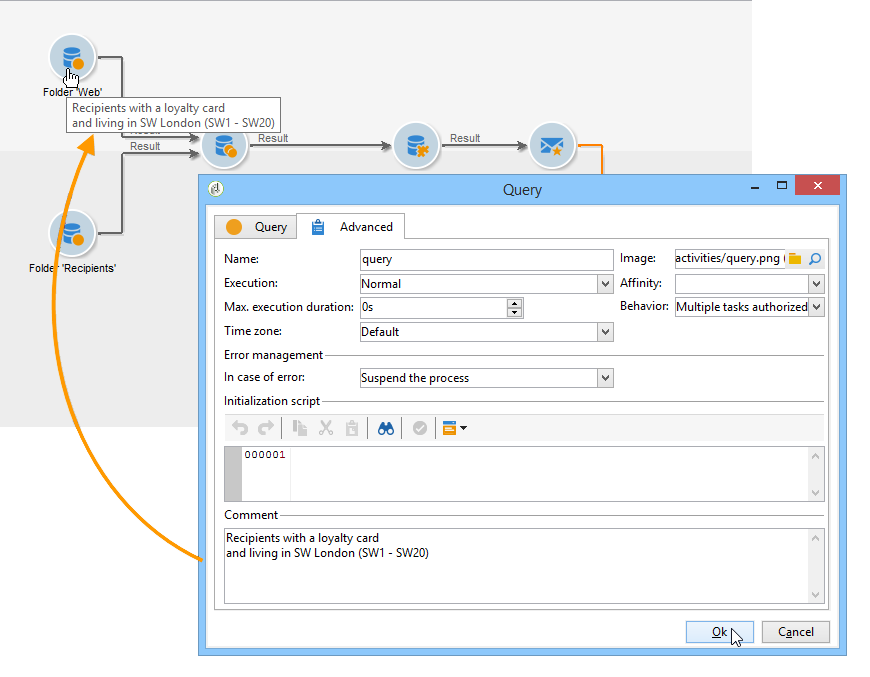 첫 번째 탭에는 기본 구성이 포함되어 있습니다. Advanced 탭에는 추가 매개 변수가 포함되어 있습니다. 이 매개 변수는 특히 오류가 발생할 때 동작을 정의하고, 활동의 실행 기간을 지정하고, 초기화 스크립트를 입력하는 데 사용됩니다.