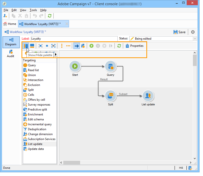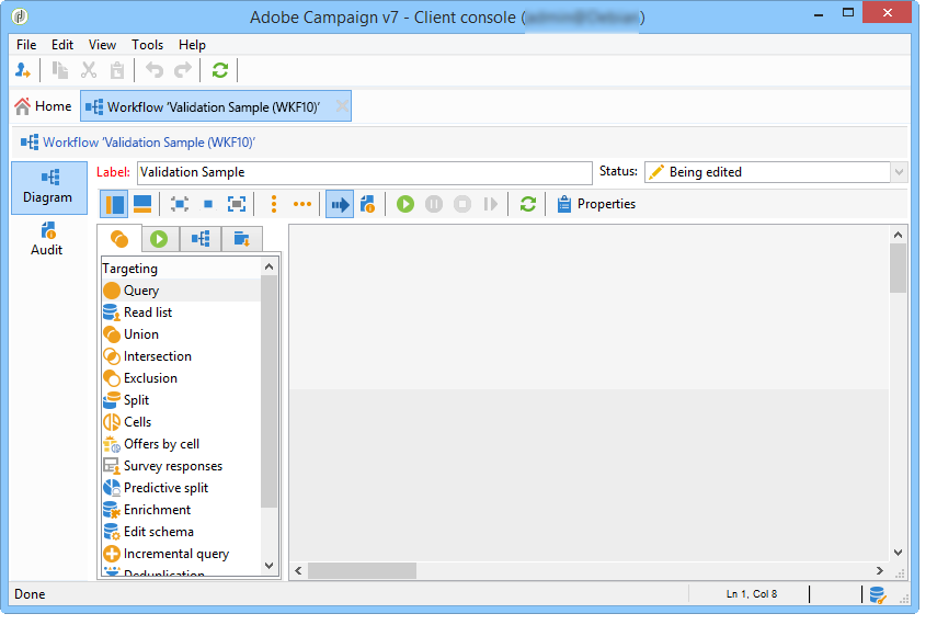 이제 다양한 활동을 정의하고 이를 다이어그램에서 함께 연결해야 합니다. 이 구성 단계에서는 다이어그램 레이블 및 워크플로 상태(편집 진행 중)를 볼 수 있습니다. 창의 아래 섹션은 다이어그램을 편집하는 데만 사용됩니다. 여기에는 도구 모음, 활동 팔레트(왼쪽) 및 다이어그램 자체(오른쪽)가 포함되어 있습니다.