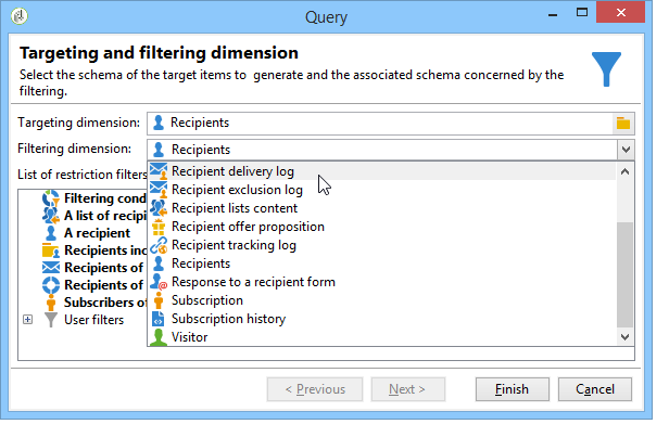 예를 들어, 5년 이상 생명 보험 계약을 보유한 클라이언트를 선택하려면 다음 대상 차원을 선택합니다. 클라이언트 및 필터링 차원: 계약 소유자. 그런 다음 쿼리 활동 내에 필터링 조건을 정의할 수 있습니다