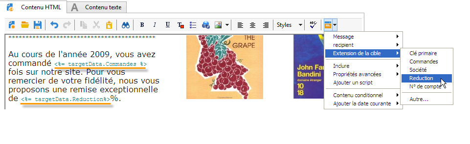Dans le cadre d'une diffusion par email, les champs de personnalisation peuvent également utiliser les données issues de l'extension de la cible réalisée dans les étapes du workflow de ciblage, comme dans l'exemple ci-dessous :