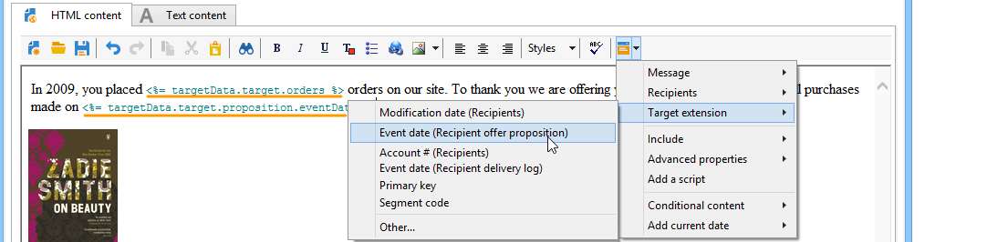 이메일 게재 프레임워크 내에서 개인화 필드는 아래 예와 같이 타깃팅 워크플로우 단계에서 수행된 target 확장의 데이터를 사용할 수도 있습니다.
