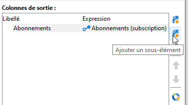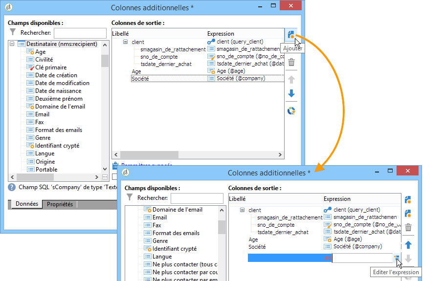 Pour ajouter des données aux colonnes de sorties déjà définies, sélectionnez-les dans la liste des champs disponibles. Pour créer une nouvelle colonne de sortie, cliquez sur l'icône Ajouter puis sélectionnez le champ et cliquez sur Editer l'expression.