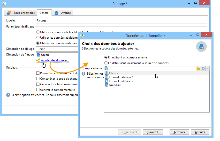 Si l'option Utiliser les données additionnelles uniquement est sélectionnée, seules les données additionnelles sont proposées pour réaliser le filtrage des sous-ensembles.
