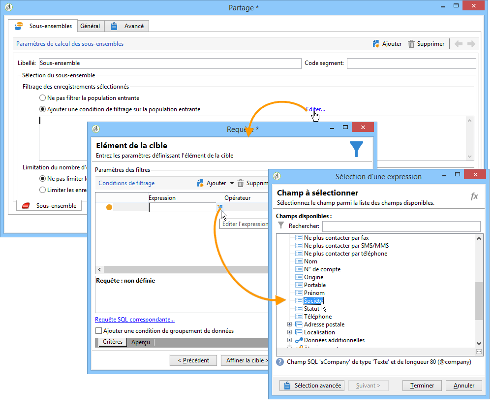 L'activité de Partage permet de créer des sous-ensembles sur des critères définis au travers de requêtes d'extraction. Pour chaque sous-ensemble, lorsque vous éditez une condition de filtrage sur la population, vous accédez à l'activité de requête standard et pouvez ainsi définir les conditions de segmentation de la cible.
