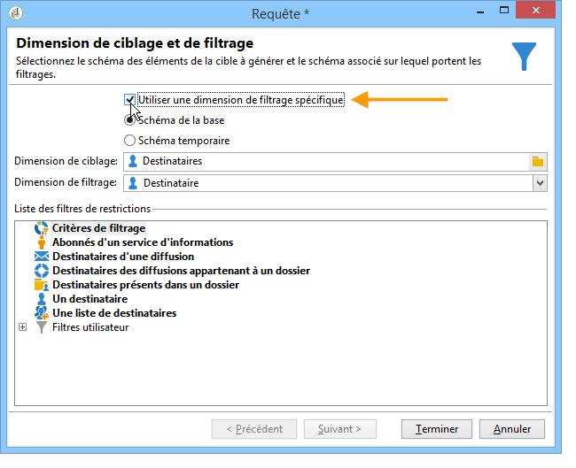 En complément de la dimension de ciblage, la dimension de filtrage permet de préciser la nature des données collectées. Voir à ce sujet la section Dimension de ciblage et dimension de filtrage.