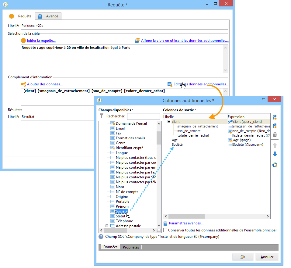 Une fois que des données additionnelles ont été ajoutées, vous pouvez les éditer ou les utiliser pour affiner la cible définie dans l'activité de requête.