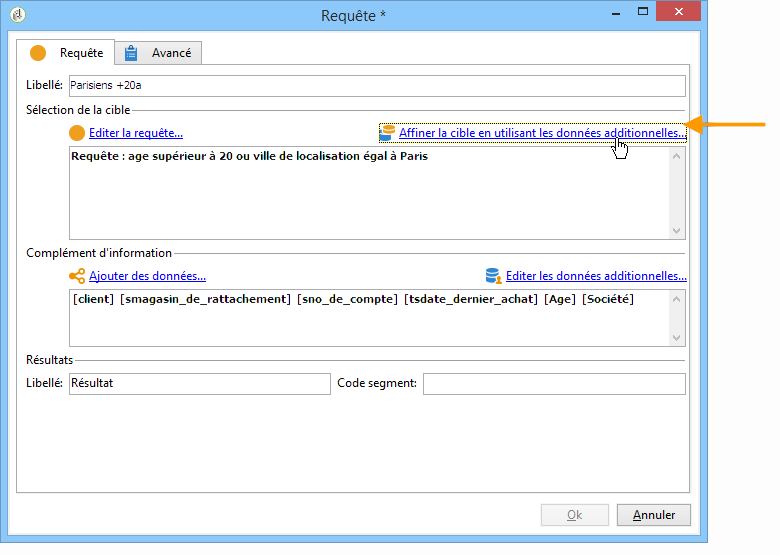 Les données additionnelles collectées peuvent permettre dʼaffiner le filtrage des données de la base. Pour cela, cliquez sur le lien Affinage de la cible en utilisant les données additionnelles… : vous pouvez ainsi sur-filtrer sur les données qui ont été ajoutées.