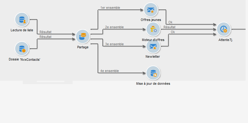 L'activité Partage est une activité standard qui permet de créer autant d'ensembles que nécessaires à partir d'une ou plusieurs dimensions de filtrage et de générer en sortie une transition par sous-ensemble ou une transition unique.