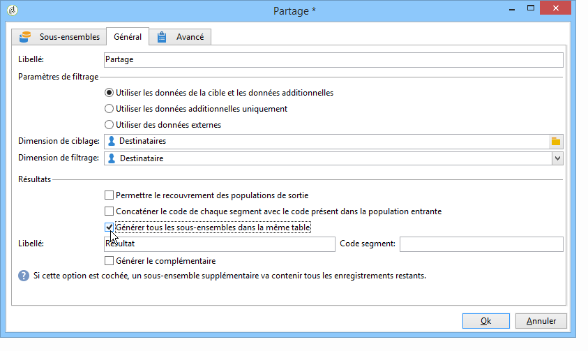 Vous pouvez regrouper tous les sous-ensembles dans une seule transition en sortie. L'appartenance à tel ou tel sous-ensemble sera alors matérialisée par exemple par le code segment. Pour cela, sélectionnez l'option Générer tous les sous-ensembles dans la même table.