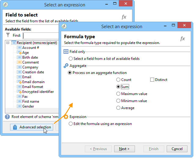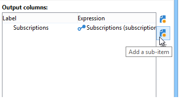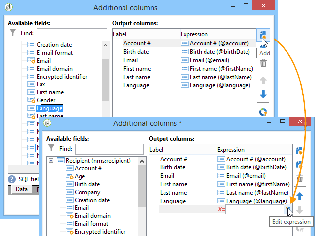 이전에 정의한 출력 열에 데이터를 추가하려면 사용 가능한 필드 목록에서 해당 데이터를 선택합니다. 새 출력 열을 만들려면 Add 아이콘을 선택한 다음 필드를 선택하고 을(를) 클릭합니다 Edit expression.