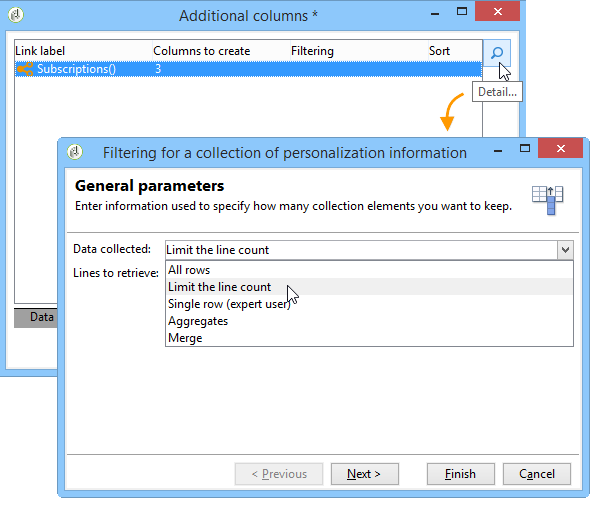 다음 Add a sub-item 옵션을 사용하면 계산된 데이터를 컬렉션에 첨부할 수 있습니다. 이를 통해 컬렉션에서 추가 데이터를 선택하거나 수집 요소에 대한 집계 계산을 정의할 수 있습니다.