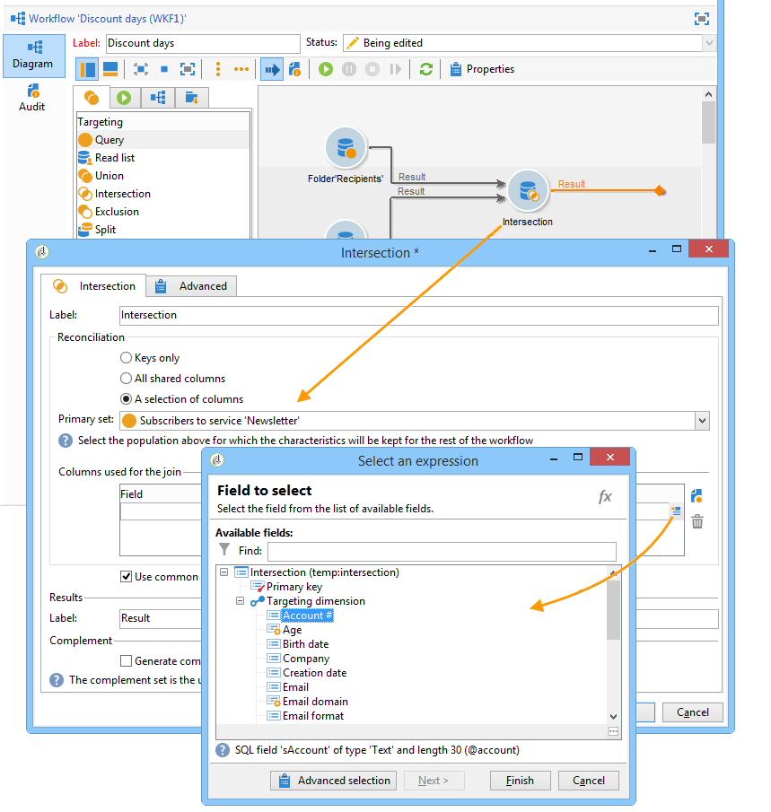 in Union 또는 Intersection 유형 활동을 사용하면 데이터를 일관되게 유지하기 위해 공유된 추가 데이터만 유지하도록 선택할 수 있습니다. 이 경우 이 활동의 임시 출력 작업 테이블에는 모든 인바운드 집합에 있는 추가 데이터만 포함됩니다.