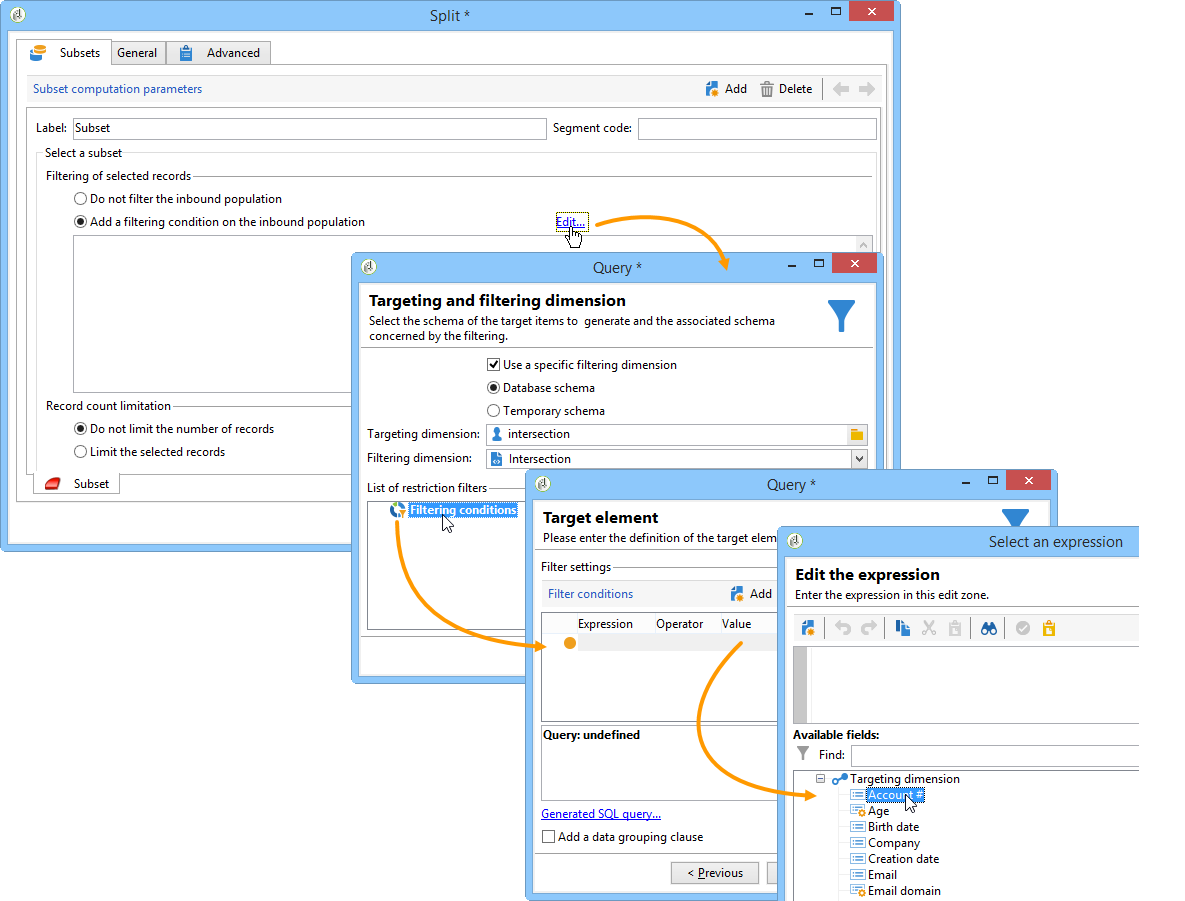 필터링 조건을 정의하려면 Add a filtering condition on the inbound population 옵션을 선택하고 Edit… 링크를 클릭합니다. 그런 다음 이 하위 집합을 만들기 위한 필터링 조건을 지정합니다.