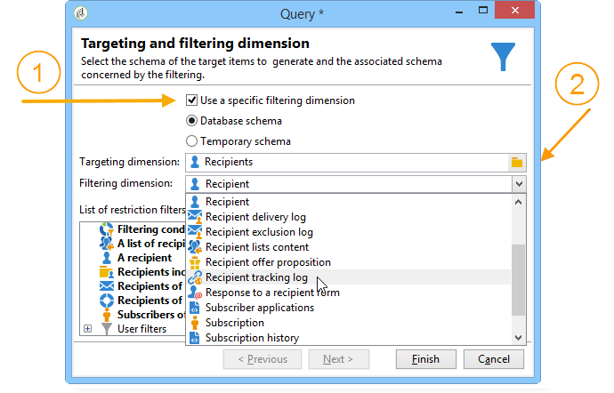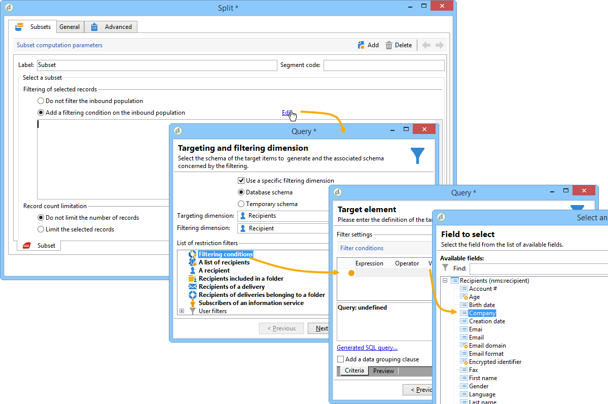 를 구입한 경우 페더레이션 데이터 액세스 옵션을 선택하면 외부 베이스의 정보를 기반으로 하위 세트를 만들 수 있습니다. 이렇게 하려면 Targeting dimension 필드. 자세한 내용은 외부 데이터베이스 액세스(FDA).