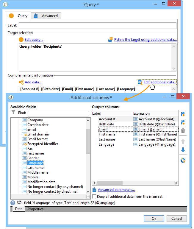 A Query 활동을 통해 기본 데이터를 선택하여 대상 모집단을 작성할 수 있습니다. 자세한 내용은 쿼리 만들기.
