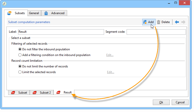 이러한 모든 하위 세트를 하나의 출력 전환으로 그룹화할 수 있습니다. 이 경우 각 하위 세트에 대한 링크는 세그먼트 코드에 표시됩니다(예: ). 이렇게 하려면 Generate all subsets in the same table 선택 사항입니다.