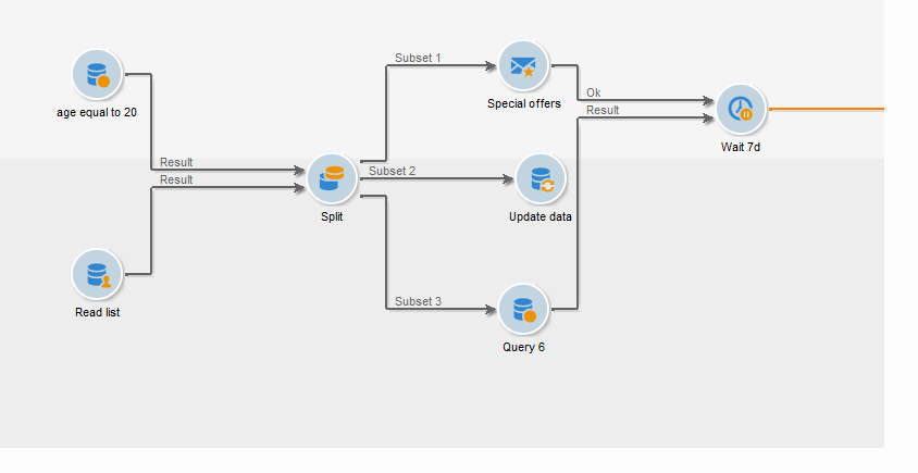 다음 Split 활동은 하나 또는 여러 필터링 차원을 통해 필요한 만큼 많은 설정을 만들고, 하위 집합당 하나의 출력 전환 또는 고유한 전환을 생성할 수 있는 표준 활동입니다.