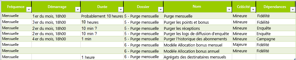 Le fait de sauvegarder les workflows dans des dossiers nommés en fonction de leur récurrence et triés par planning d'exécution augmente l'efficacité de la surveillance.