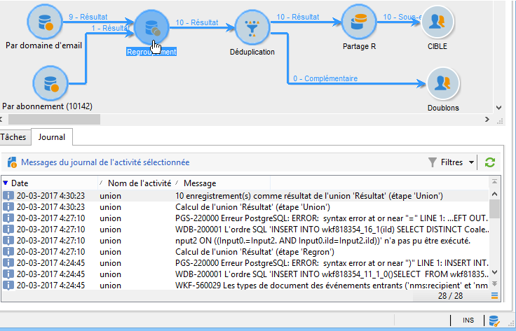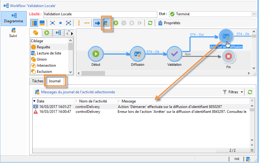 Le journal affiche la liste chronologique des messages d'exécution des activités du workflow de ciblage.