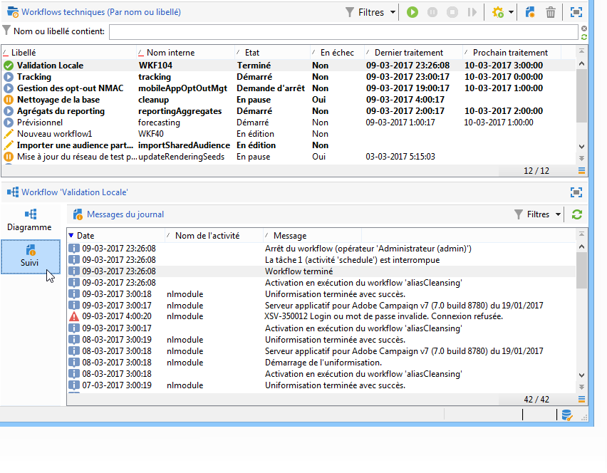 En outre, les administrateurs de l’instance peuvent utiliser le journal d’audit pour vérifier les activités et les dernières modifications apportées aux workflows, c’est-à-dire l’état de vos workflows. Pour en savoir plus à ce sujet consultez le Guide de production de Campaign Classic v7.