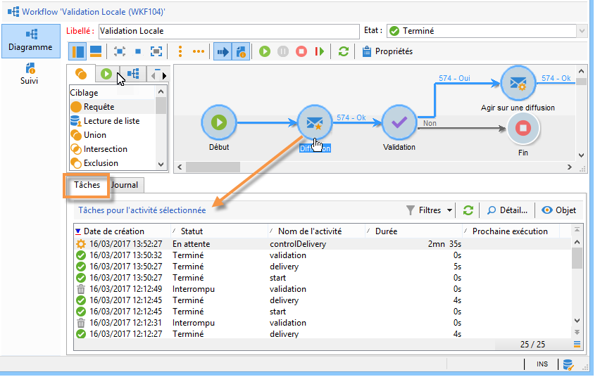 Visualiser uniquement les messages associés à une tâche particulière. Pour cela, sélectionnez l'onglet Tâches puis cliquez sur une activité du diagramme pour limiter la liste à une activité particulière. Double-cliquez sur une tâche pour afficher toutes les informations ; le dernier onglet de la fenêtre permet d'afficher le journal.