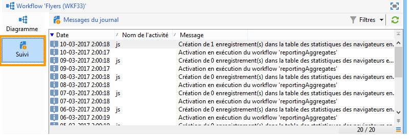 Sélectionner l'onglet Suivi du détail. Cette liste affiche tous les messages du workflow.